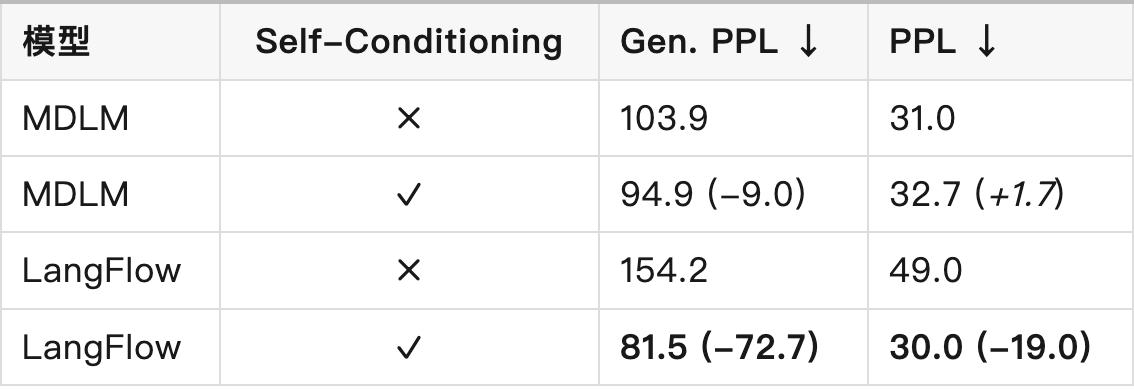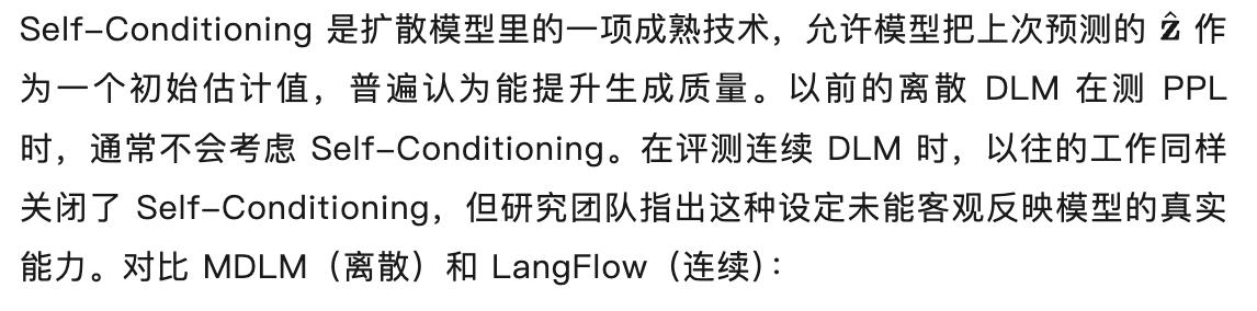 研究团队通过对比实验指出:关闭 Self-Conditioning 的对比对连续 DLM 是不公平的。