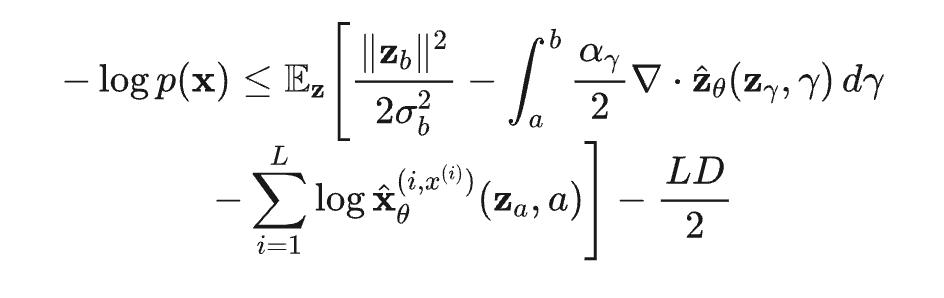 这个上界由三部分构成:第一项是从噪声中抽取轨迹起点的 NLL;第二项是 ODE 对概率密度的压缩或膨胀;第三项是从轨迹终点还原 token 的 NLL。最后的一项,是以上三项中的常数项相互抵消剩下的总和。