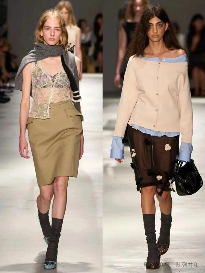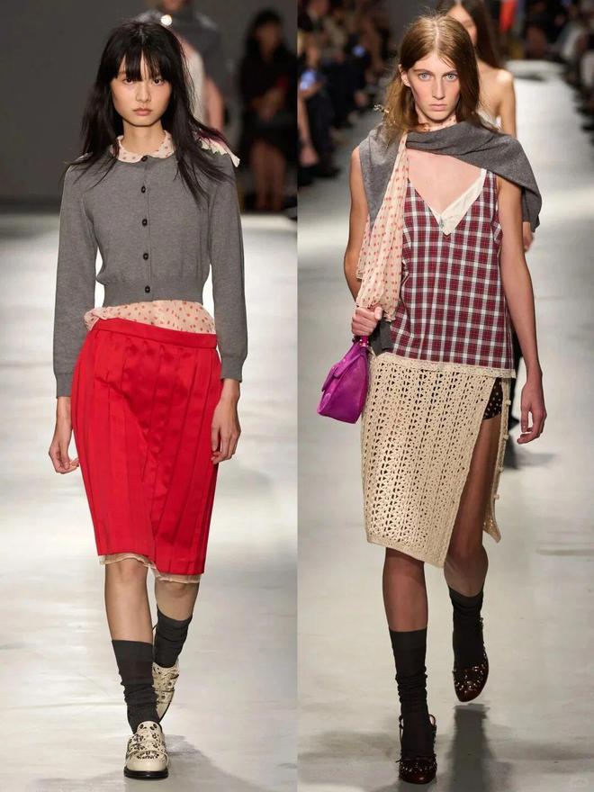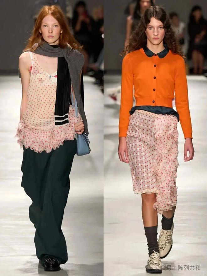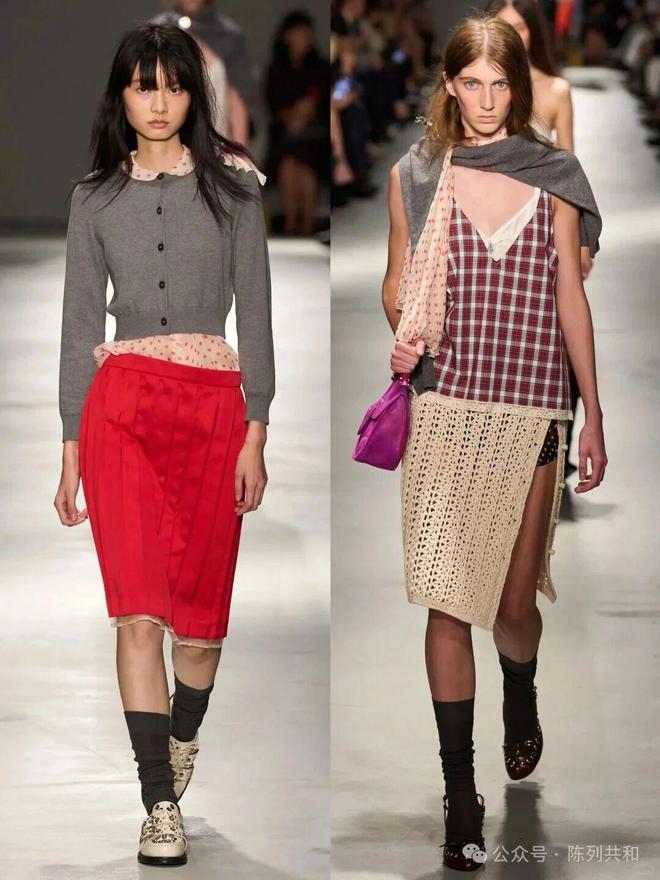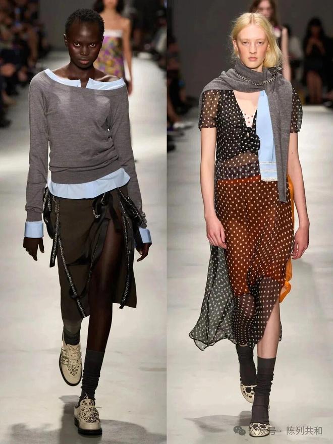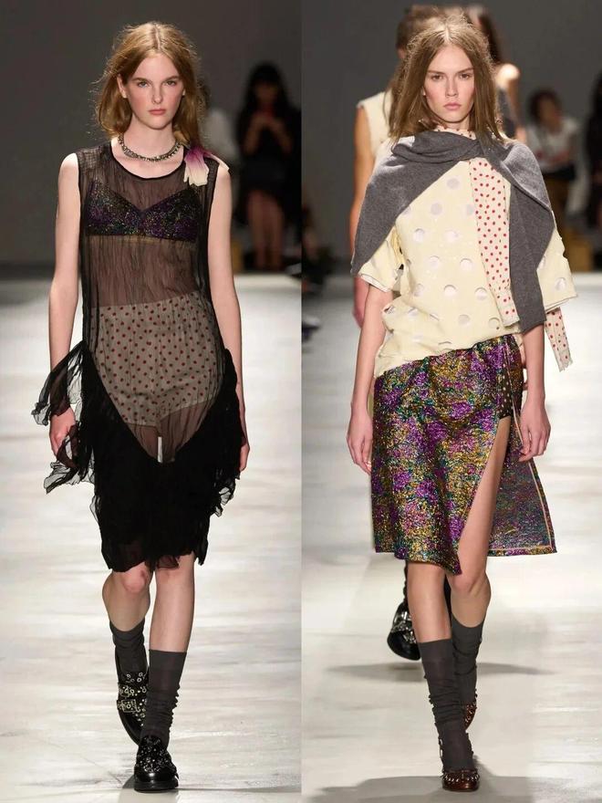 2. 皮衣、网纱等材质的不规则层叠混搭,展现出不羁的个性。例如包括脖子波点与拼色的丝巾叠带,不规则剪裁的透视半裙+勾丝边,体现出一种随性洒脱、不受束缚的态度。