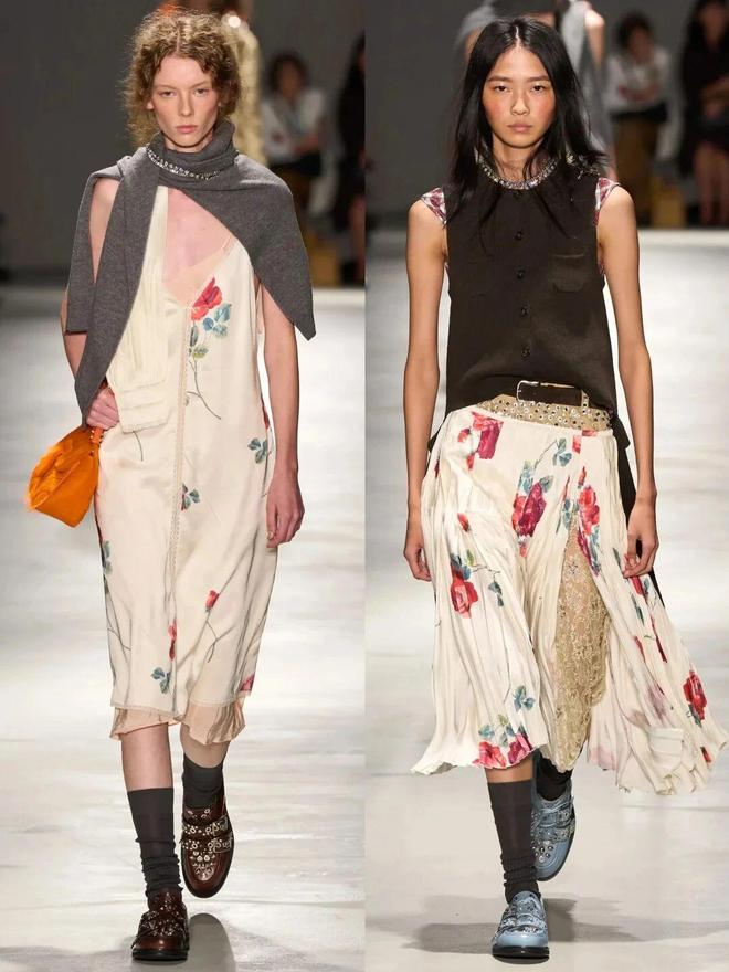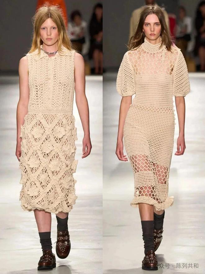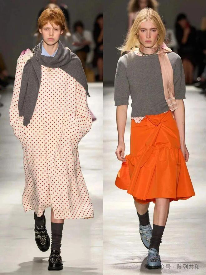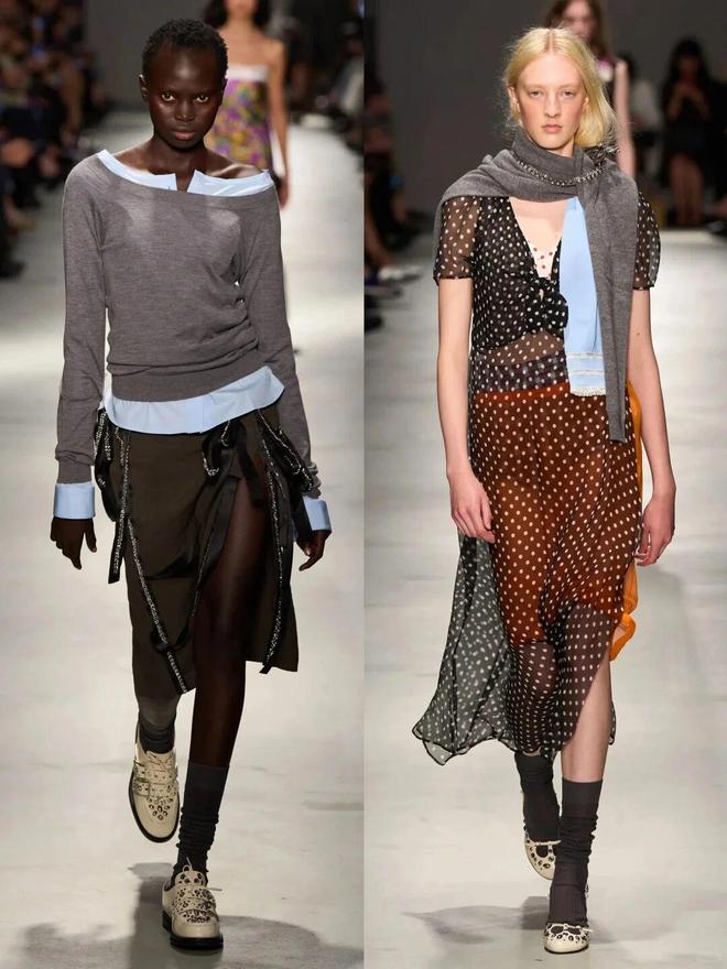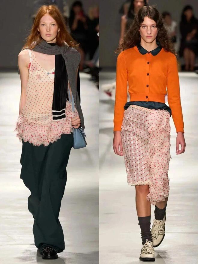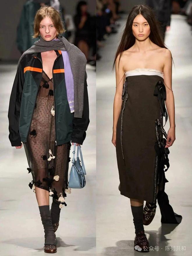 2. 皮衣、网纱等材质的不规则层叠混搭,展现出不羁的个性。例如包括脖子波点与拼色的丝巾叠带,不规则剪裁的透视半裙+勾丝边,体现出一种随性洒脱、不受束缚的态度。