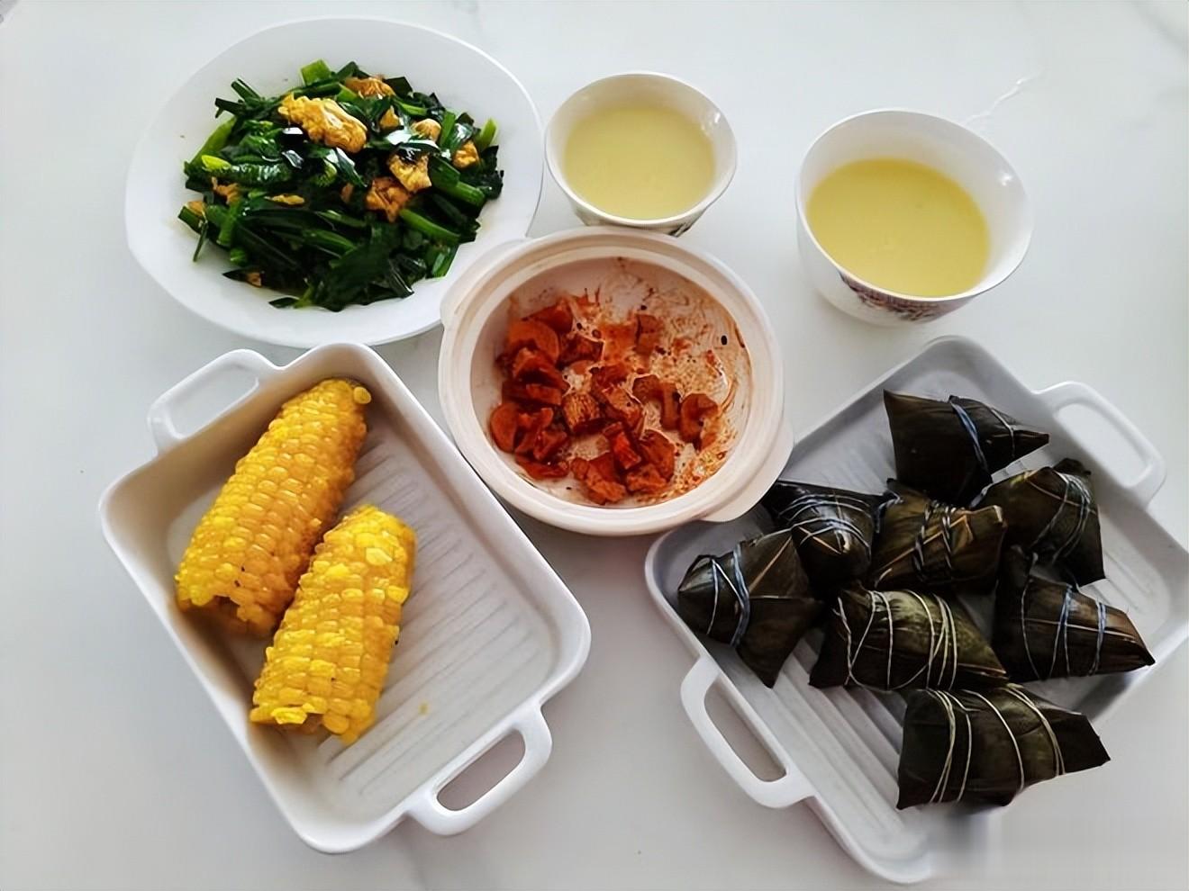 这就是我家暖烘烘的早餐了,六种搭配,粽子——黄糯玉米,还有小黄米,更有韭菜炒鸡蛋,还有麻辣萝卜干,怎么样?