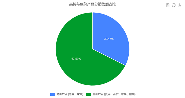 饼图展示了高价产品(电器、家具)和低价产品(食品、百货、水果、服装)的总销售额占比。通过该图可以直观地看到两类产品在总销售额中的比例分布。