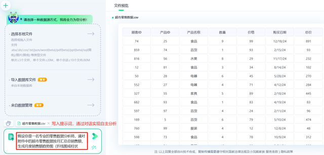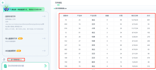 点击选择本地文件可以上传数据源表格,界面如下,当然,目前小浣熊也支持从数据库中直接上传数据,本节使用一组超市零售数据,包含顾客ID、产品ID、产品名称、数量、价格、购买日期、总价这几个数据字段。