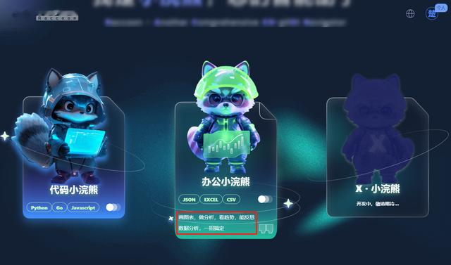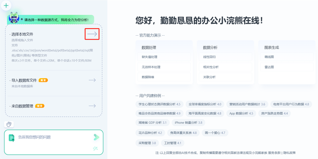 登录官网以后,选择中间的办公小浣熊,该应用目前支持JSON、Excel、CSV三种数据类型,可以用于画图表,做分析,看趋势,能反思,使用办公小浣熊AI可以一招搞定数据分析。