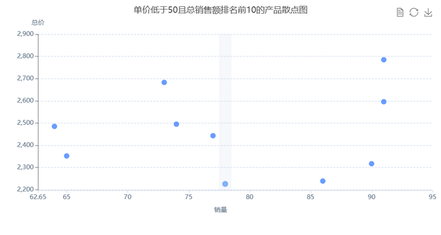 散点图展示了单价低于50且总销售额排名前10的产品,X轴代表销量,Y轴代表总价。通过该图可以直观地看到这些产品的销量与总销售额之间的关系。