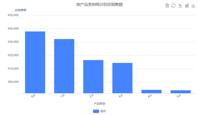 从柱状图中可以看出,百货类别的总销售额最高,而电器类别的总销售额最低。通过按产品类别统计的总销售额,可以直观地看到不同类别的销售表现。