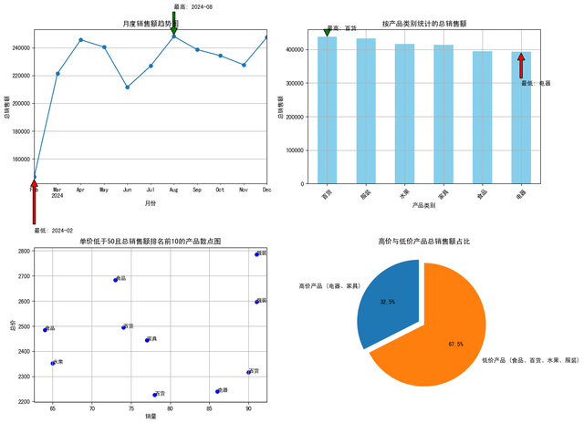月度销售额趋势图:展示了全年各个月份的总销售额变化趋势,12月的销售额最高,2月的销售额最低,显示出明显的季节性波动。按产品类别统计的总销售额柱状图:显示了不同产品类别的总销售额,百货类产品的销售额最高,电器类产品的销售额最低。单价低于50且总销售额排名前10的产品散点图:展示了单价较低但总销售额较高的前10个产品,X轴为销量,Y轴为总价,帮助我们识别出具有较高销售潜力的低价产品。高价与低价产品总销售额占比饼图:显示了高价产品(电器、家具)和低价产品(食品、百货、水果、服装)在总销售额中的占比,帮助我们了解不同价格区间产品的销售贡献。整体数据分析结论: