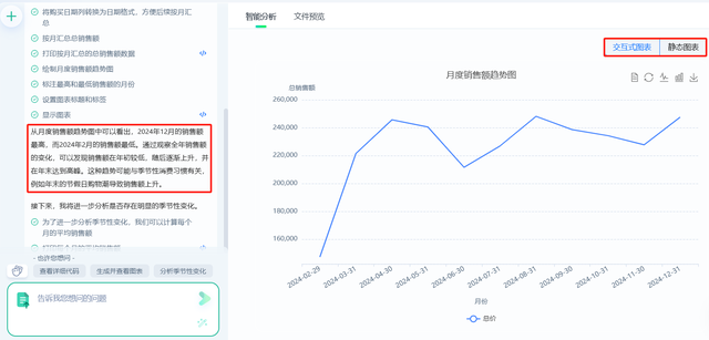 时间趋势分析:销售额是否存在季节性变化?哪个月份的销售额最高或最低?各产品类别的销售情况:哪些产品类别(食品、百货、水果、电器、家具、服装)的销售额最高?哪些最低?销售额与购买数量的关系:是否存在某些产品虽然单价较低,但由于销量高,总销售额反而较高?高价产品(如电器、家具)和低价产品(如食品、百货)的销售占比如何?1.时间趋势分析首先做时间趋势分析,可以通过计算每个类别的总销售额和平均销售额来分析,在对话框中写入下面的提示词。