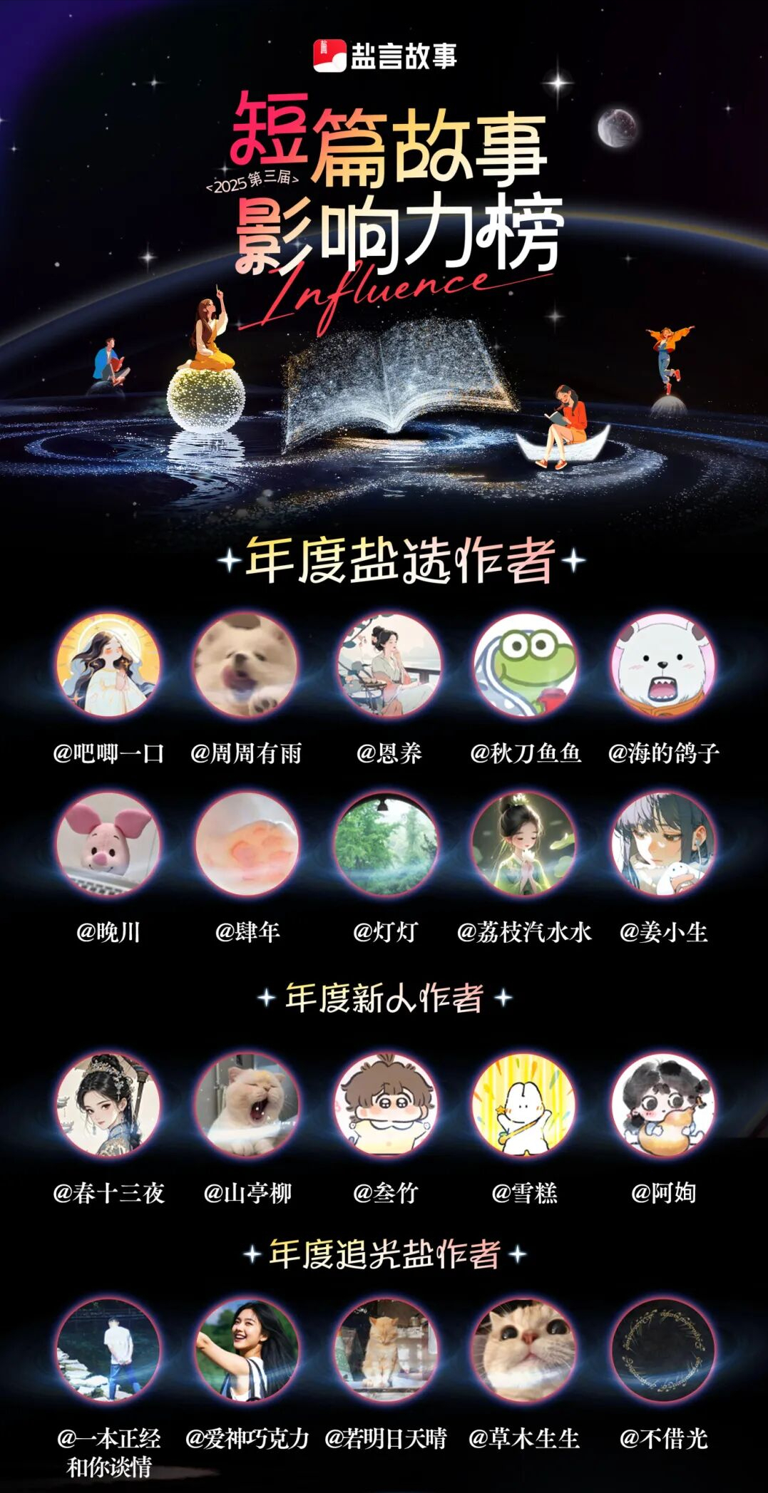 当晚,盐言故事发布第三届短篇故事影响力榜。连续举办三年来,该榜单已经成为短篇故事领域极具公信力和权威性的年度盛事。