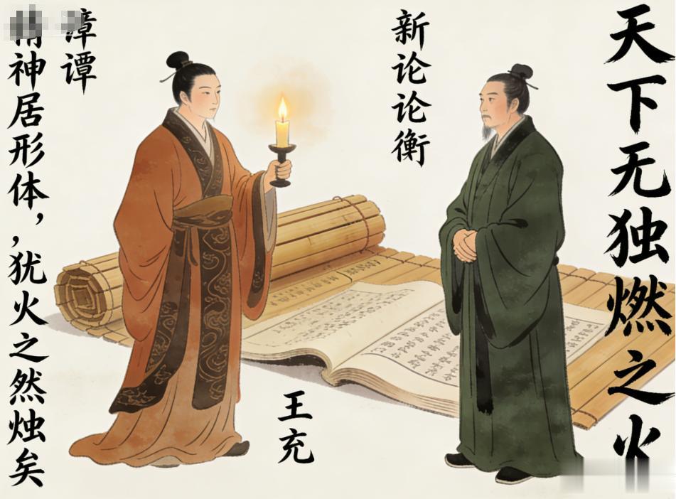 东汉桓谭提出:“精神居形体,犹火之然(燃)烛矣”,将精神与形体的关系比喻为火与烛的关系,形象地说明了精神依赖于形体而存在 。王充继承此说,进而提出:“天下无独燃之火,世间安得有无体独知之精?” 进一步强调了精神不能脱离形体而单独存在 。然而,这种以烛火比喻形神关系的观点,虽然表明了心理不能离开躯体而独存,但存在唯物二元论的缺陷,被唯心论者所利用,如东晋慧远就以火可以传薪为由来宣扬神不灭论。