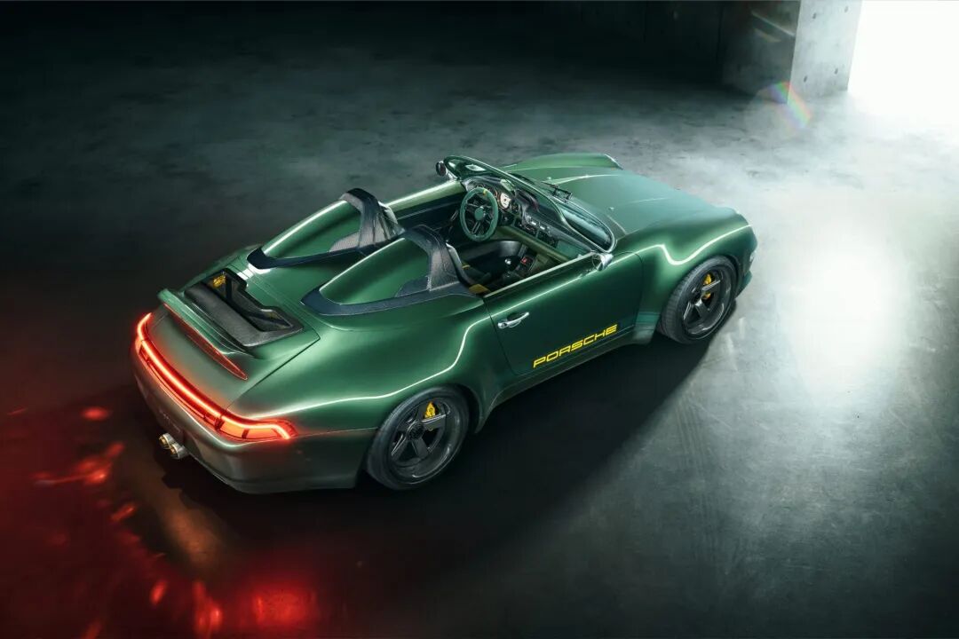 这辆车采用了定制的杜松树绿金属漆,搭配哑光绿色侧面条纹和黄色保时捷标识。