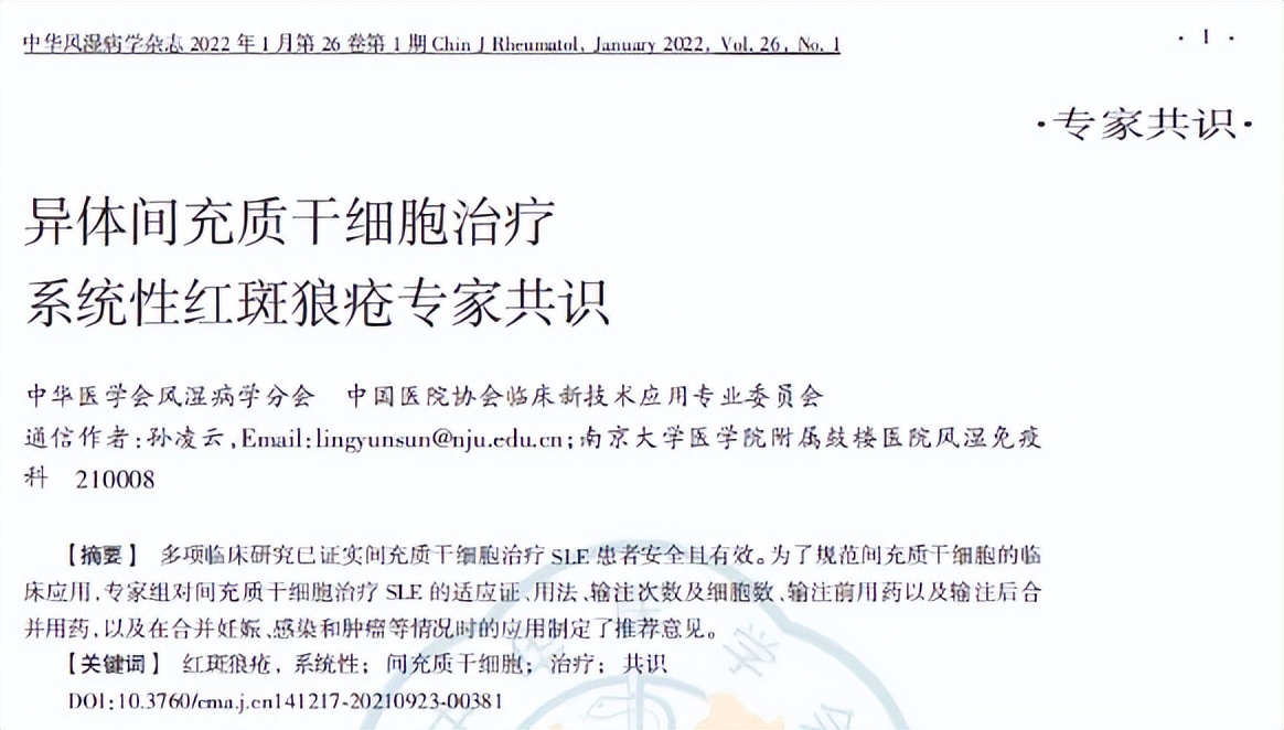 2022年1月《中华风湿病学》杂发表《异体间充质干细胞治疗系统性红斑狼疮专家共识》,明确表示:多项临床研究已证实间充质干细胞治疗系统性红斑狼疮患者安全且有效。