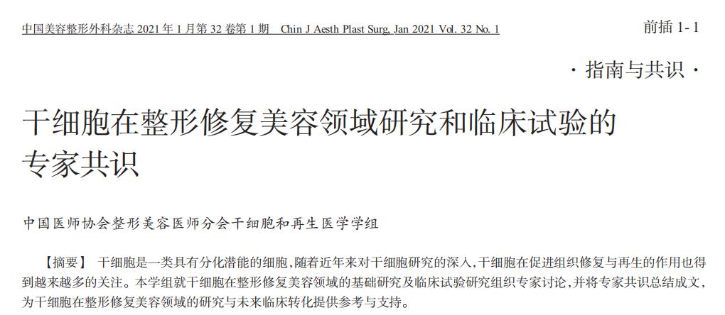 2021年《中国美容整形外科杂志》刊发《干细胞在整形修复美容领域研究和临床试验的专家共识》,以期沟通和提高我国整形修复美容领域从事干细胞基础和临床研究工作者的认知,以更好地推动干细胞的临床转化应用研究。