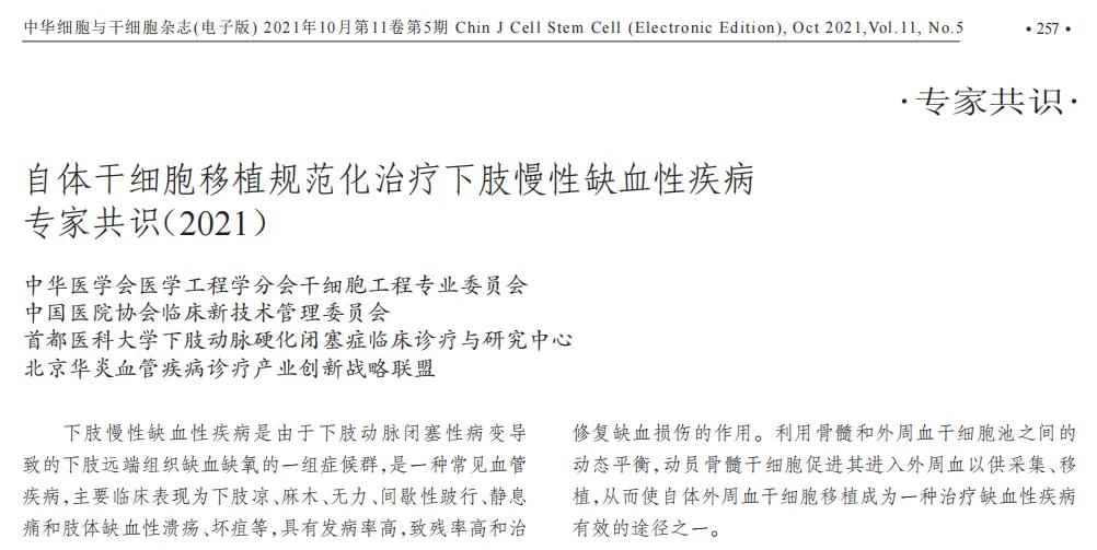 发布机构:中华医学会医学工程学分会干细胞工程专业委员会,中国医院协会临床新技术管理委员会,首都医科大学下肢动脉硬化闭塞症临床诊疗与研究中心,北京华炎血管疾病诊疗产业创新战略联盟