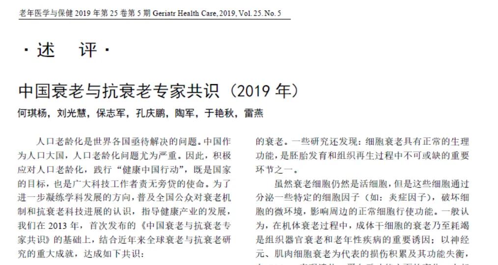 2019年,我国《老年医学与保健》杂志上发布的《中国衰老与抗衰老专家共识(2019年)》。
