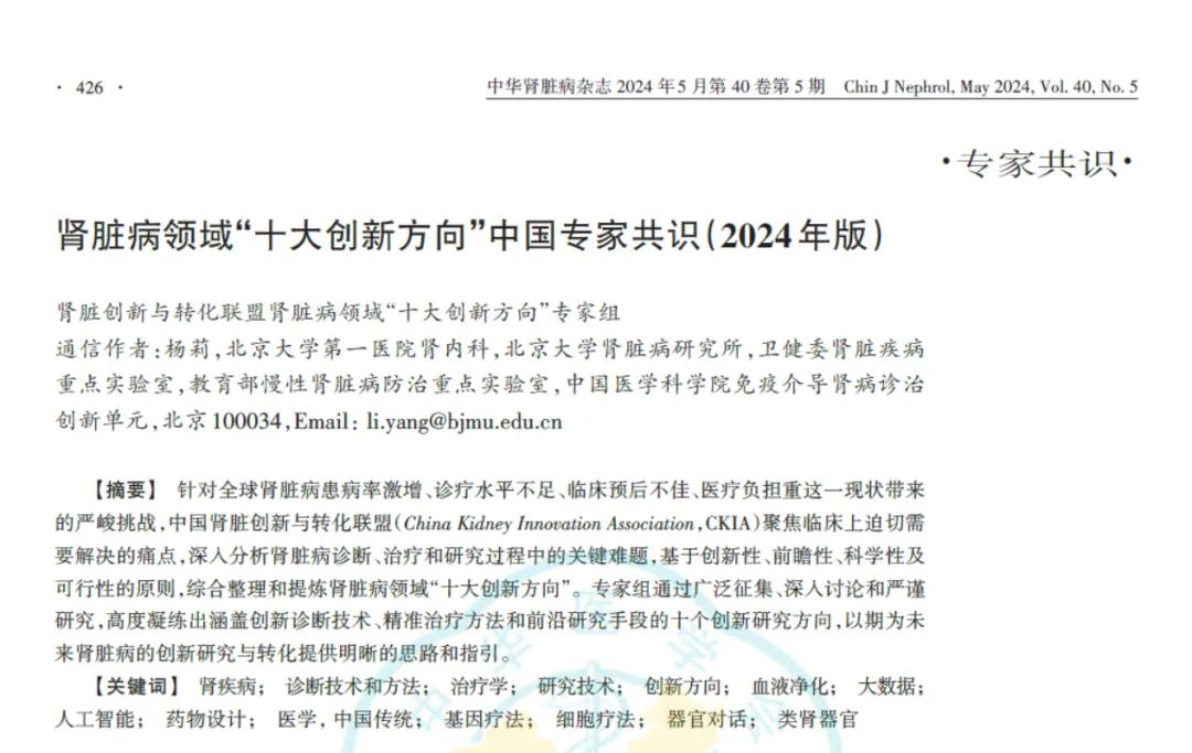 中国肾脏创新与转化联盟(China Kidney Innovation Association,CKIA)聚焦临床上迫切需要解决的痛点,深入分析肾脏病诊断、治疗和研究过程中的关键难题,基于创新性、前瞻性、科学性及可行性的原则,综合整理和提炼肾脏病领域“十大创新方向”。