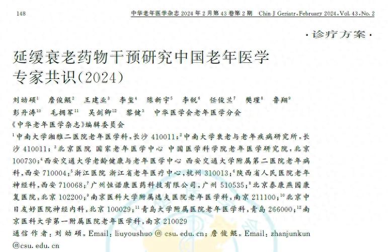 2024 年 2 月,《中华老年医学杂志》刊载了《延缓衰老药物干预研究中国老年医学临床专家共识 2024》。这份共识由中华医学会老年医学分会牵头,汇聚了我国老年医学领域中从事延缓衰老药物干预研究的相关专家与学者共同完成。