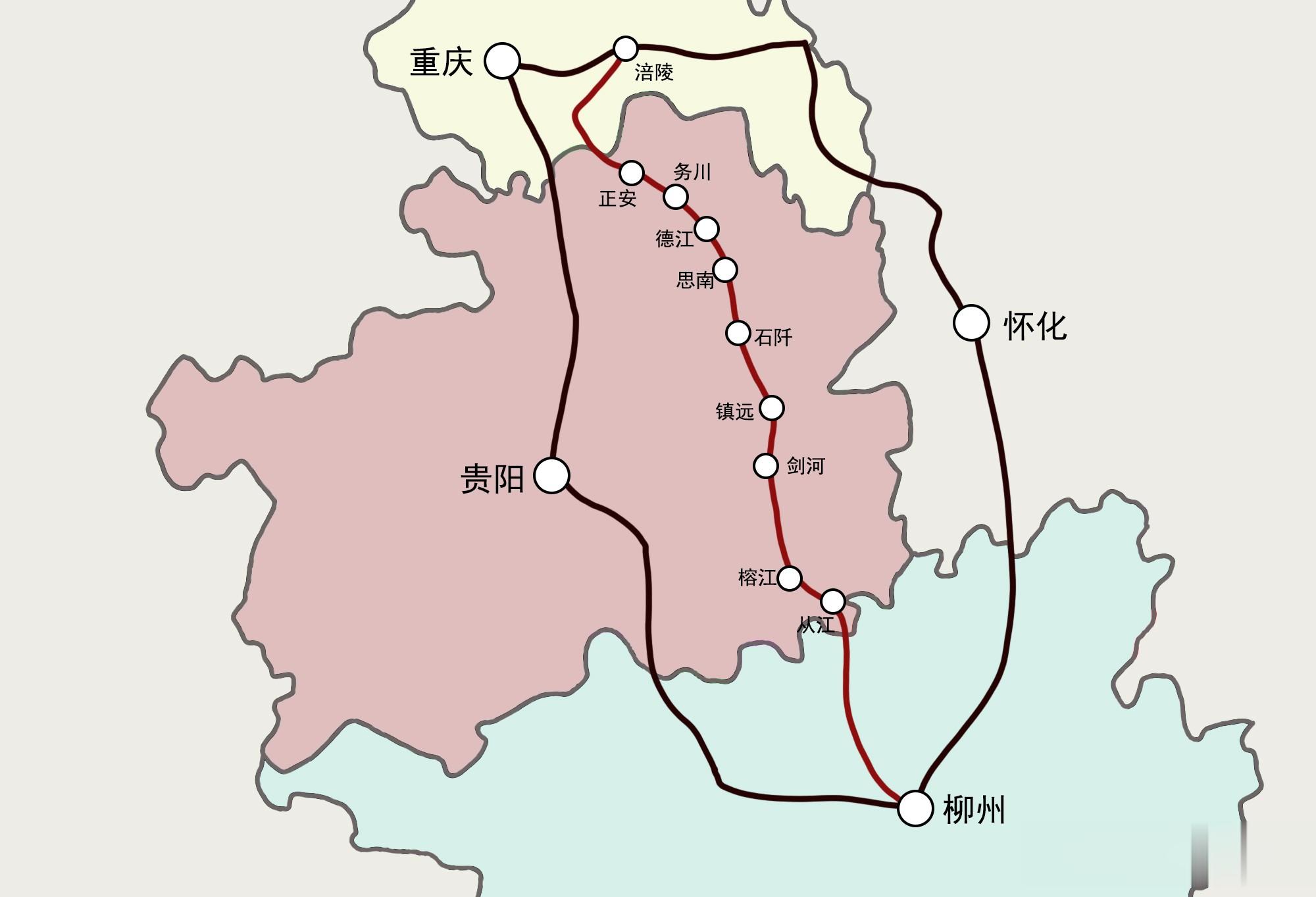 比如,渝怀铁路,北到重庆,南到怀化,经过贵州的铜仁。这条铁路就是重庆建设的可以连接焦柳铁路的重要线路。连接上了怀化,重庆就多了一条南下两广的道路。为了扩大渝怀铁路的运输能力,2009年开始,该铁路又开始进行了二线建设。但渝怀铁路只是路过了贵州的一个角,是顺便让铜仁通了铁路。对于贵州而言,真正的大动脉必须是直接穿越贵州的铁路动脉,分别是隆百铁路、川黔铁路二线和涪柳铁路。