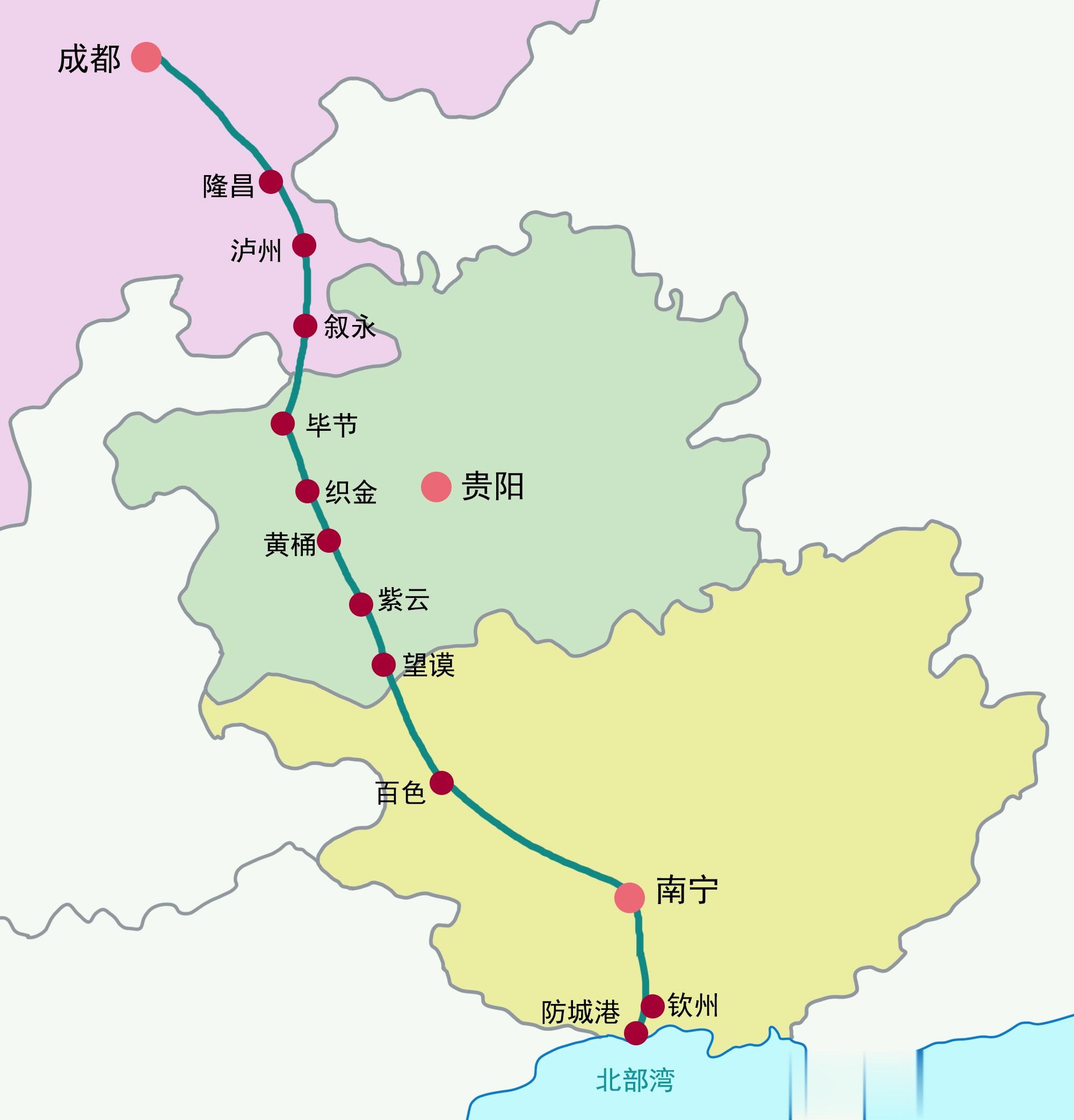 先来说隆百铁路。隆百铁路,北到四川的隆昌市,南至广西百色市,中间经过了贵州毕节、安顺、黔西南三大地区。该铁路是四川盆地到达北部湾最快的货运通道,也是效率最高的出海货运通道。该铁路由多段组成,其中隆昌—叙永段,黄桶—织金段在2013年通车,叙永—毕节段在2023年通车。2023年,黄桶—百色段开始开工建设。该铁路的断断续续修建,让贵州的毕节、织金、大方、普定、紫云、望谟结束了过去不通火车的历史,意义深远。