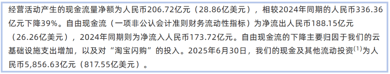 巨头们的补贴损耗肉眼可见。阿里该季度的非公认会计准则利润为335.1亿元,较2024年同期的406.91亿元下滑了18%。自由现金流则为净流出188.15亿元,2024年同期则为净流入173.72亿元。