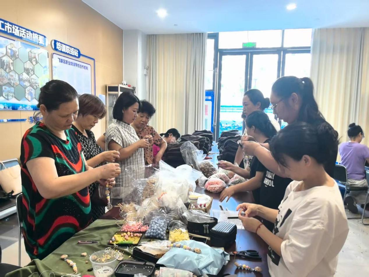 在实操环节,工作人员将提前准备好的抽绳布片、彩色串珠、钩针毛线等材料分发给居民,陆续演示穿抽绳、串链子、钩针编织等项目。“以前在家没事干,现在学了钩针,既能打发时间,还能赚点零花钱,太实用了!”62岁的社区居民张阿姨一边跟着练习钩织发饰,一边笑着说。现场还有不少宝妈拿出手机拍摄教程视频,打算回家后跟着反复练习。