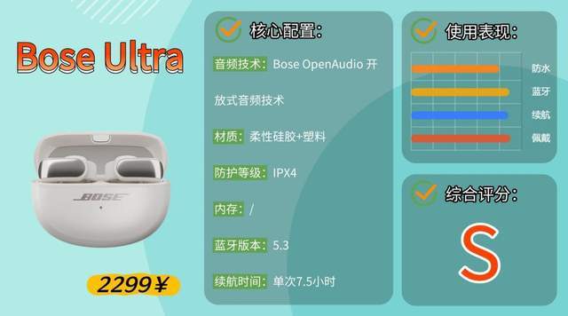 总结:Bose Ultra凭借顶尖声学调校和人性化设计,成为高端耳夹式耳机的代表,兼容眼镜与运动帽,长时间佩戴无负担,完美适配注重体验感的轻运动人群与都市通勤族。