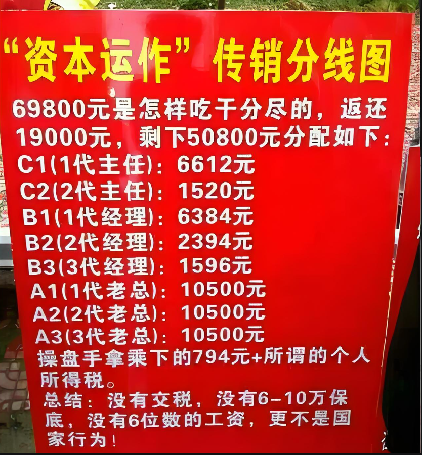 那时的她不知道,所谓“上总”门槛极高——需达到500份且8人在位,还要三条线均上经理,即便达标,老总会故意以“团队不稳”设阻;更不知道“53%资金投入国家项目”是谎言,这笔钱早已被上层瓜分,上总后也只能从超出500份的部分按每份500元分成。