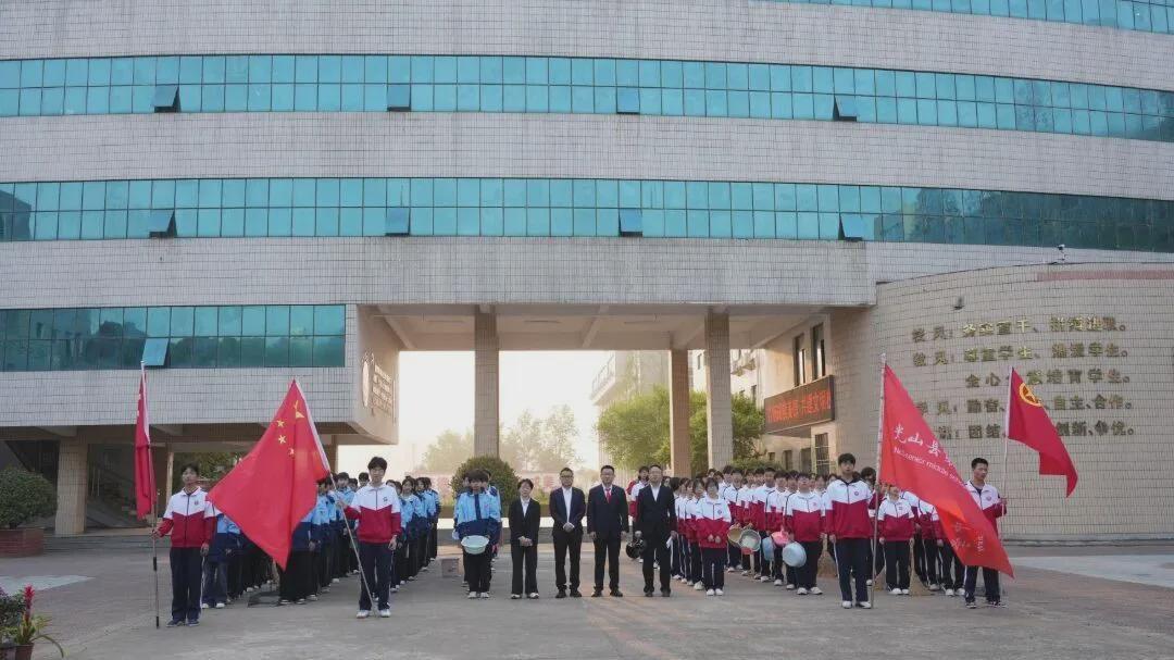 晨光熹微,肃穆整装。上午7:20,参与活动的师生在厚德楼广场集合完毕。同学们身着校服,精神抖擞;教师们西装领带,庄重肃穆;党员同志佩戴党徽,初心如磐。整齐的队伍、鲜明的旗帜,彰显着光山三高师生对革命先烈的崇高敬意。