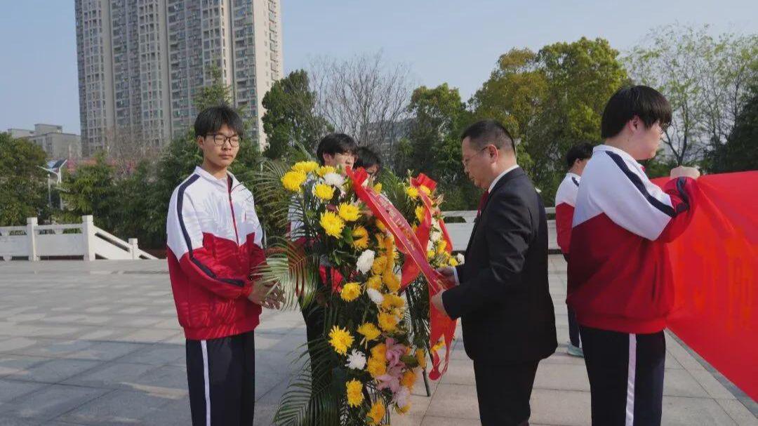 抵达烈士陵园后,全体师生整齐列队,在庄严肃穆的氛围中,向革命烈士纪念碑敬献花篮。校党委书记郑钢与师生代表一同整理绶带,寄托对革命先烈的深切缅怀与崇高敬意。