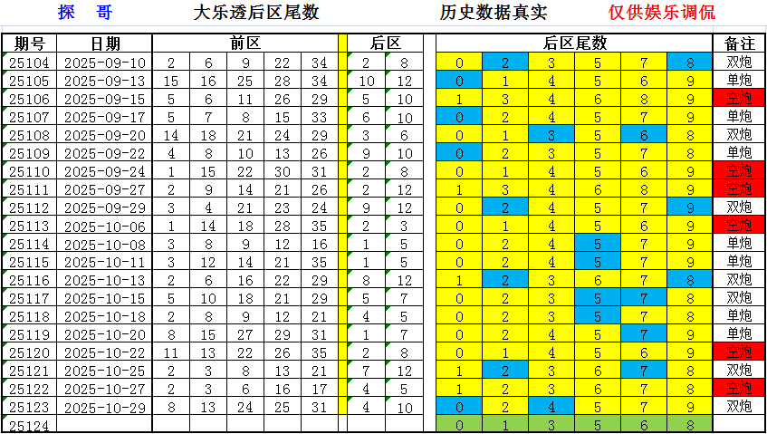 第123期后区胆尾:024579尾,开04、10,“双响炮”;