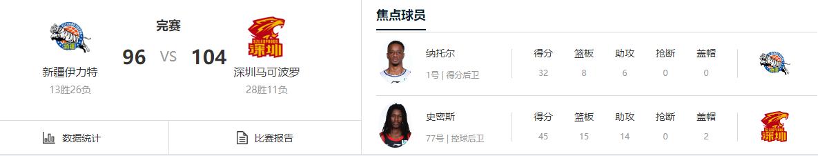 深圳-新疆两队大打对攻战,深圳队国内球员状态欠佳,还好外援支棱起来,史密斯接管比赛,首节里突外投独得19分挡不住,随后约翰逊也从替补席站出来。新疆男篮高开低走,次节强度有所提升,进攻效率直线下滑,单节仅13分且命中率不足三成,从领先被反超,这样半场52-58落后六分。