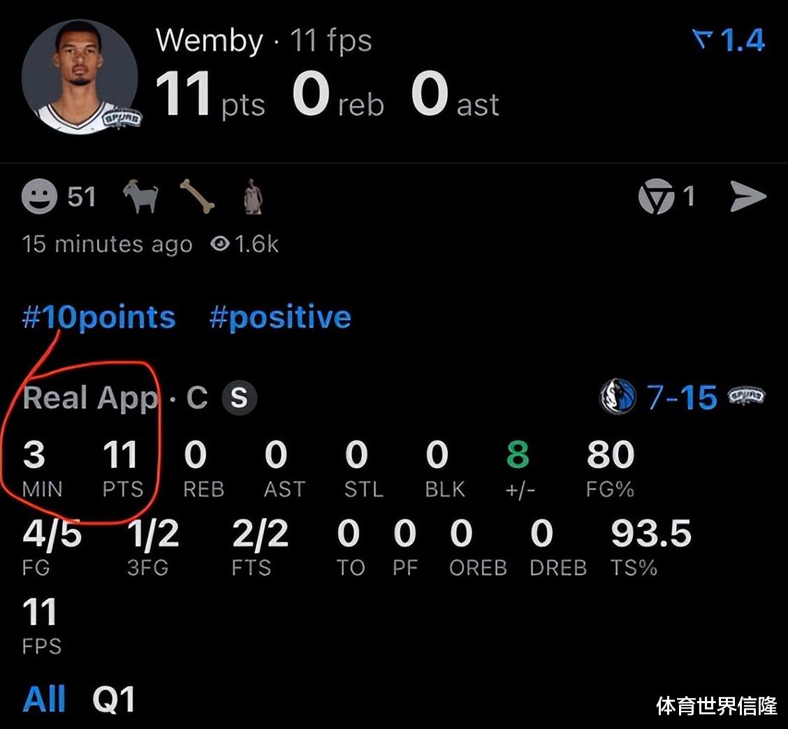 为了达到赛季出场65次的评奖标准,马刺的文班亚马今天复出了,结果他仅出战26分钟就砍下40分13板5助攻2封盖的惊人数据,这样惊世骇俗的表现,即便是历史第一人也会感到万分惊讶,表示当年自己这么年轻时无法在26分钟出场时间里打出这种数据。