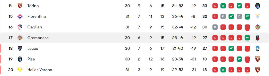 克雷莫纳本赛季整体表现低迷,目前以6胜9平15负积27分位列意甲第17位,保级形势岌岌可危。不过球队近期状态略有回暖,上一轮联赛客场2-0击败帕尔马,终结了此前15轮不胜的颓势,这场胜利也极大提振了球队士气。但主场表现依旧疲软,近7个主场0胜3平4负,仅打入3球却丢12,主场胜率不足15%,进攻端效率低下、防守漏洞百出是主场拿分难的核心问题。