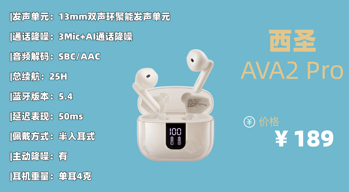·主打优势:有没有适合学生党的百元半入耳蓝牙耳机?平时听歌、通话都够用,性价比还高。西圣AVA2 Pro 我亲测好用,在200元价位里音质拔尖,百元预算就能越级体验。西圣AVA2 Pro半入耳降噪蓝牙耳机的配置堪称开挂级,上线之后讨论热度非常高,各路评测达人都乐忠于拿它跟众多品牌旗舰款进行对比,面对不少1500元级别的旗舰也不落下风!音质好佩戴舒适降噪,百元价位能拥有如此配置,源于西圣品牌对极致体验的追求,非时尚,低调、务实。而不是一味的去添加一些不实用的动能,作为炒作的噱头,更不会像走高端产品溢价的路线,而是给消费者实实在在的实惠!