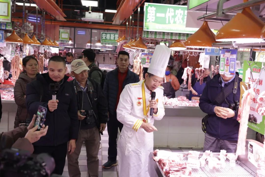 在生鲜区中,周大厨为市民讲解如何挑选新鲜的猪肉及猪肉各个部位的做法,市民争先向前提问学习。