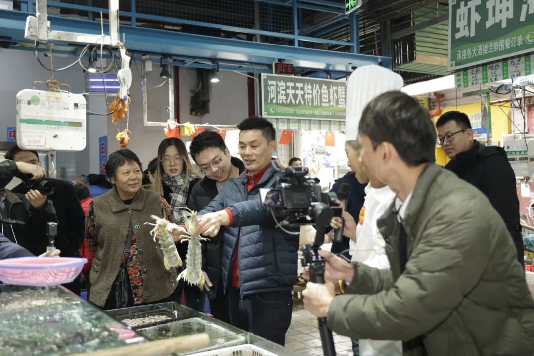 走到了玉米蔬菜档前,周大厨挑选了美食教学所需的蒜头、大葱和青椒等食材;在海鲜区挑选生猛的九节虾,大厨在挑选时夸赞河滨市场分区明显,食材产品新鲜,环境规范整洁。