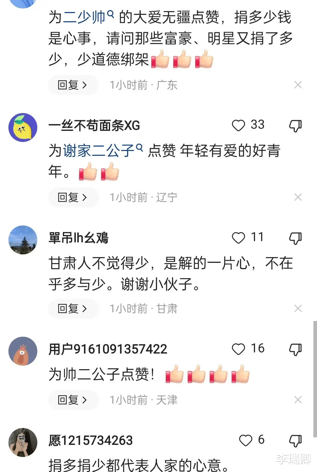 有甘肃的网友评论,甘肃人不觉得少,是解清帅的一片心,不在乎多与少。谢谢解清帅和解爸。