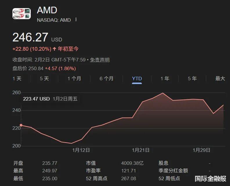 截至当地时间2月2日收盘,受乐观的市场预期影响,AMD股价在常规交易时段上涨约4%,盘后交易中进一步上涨。目前报246.27美元,市值4009.38亿美元。