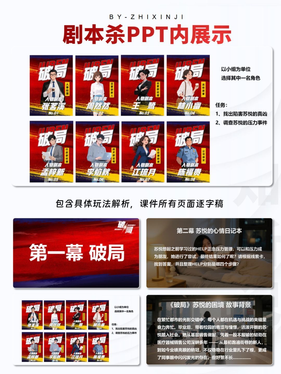 第二章则引入剧本杀环节——8个角色、8张线索卡,还原主角的真实压力故事。学员分组推理,在沉浸式探案中主动寻找解决方案。这种以学员为中心的互动方式,不仅提升了课堂氛围,也让HELP四步法(即正视、表达、厘清、实践)牢牢印在每个人心里。