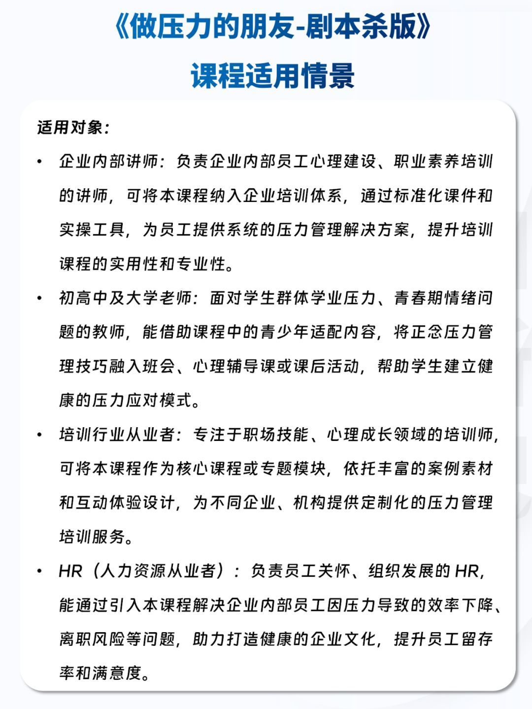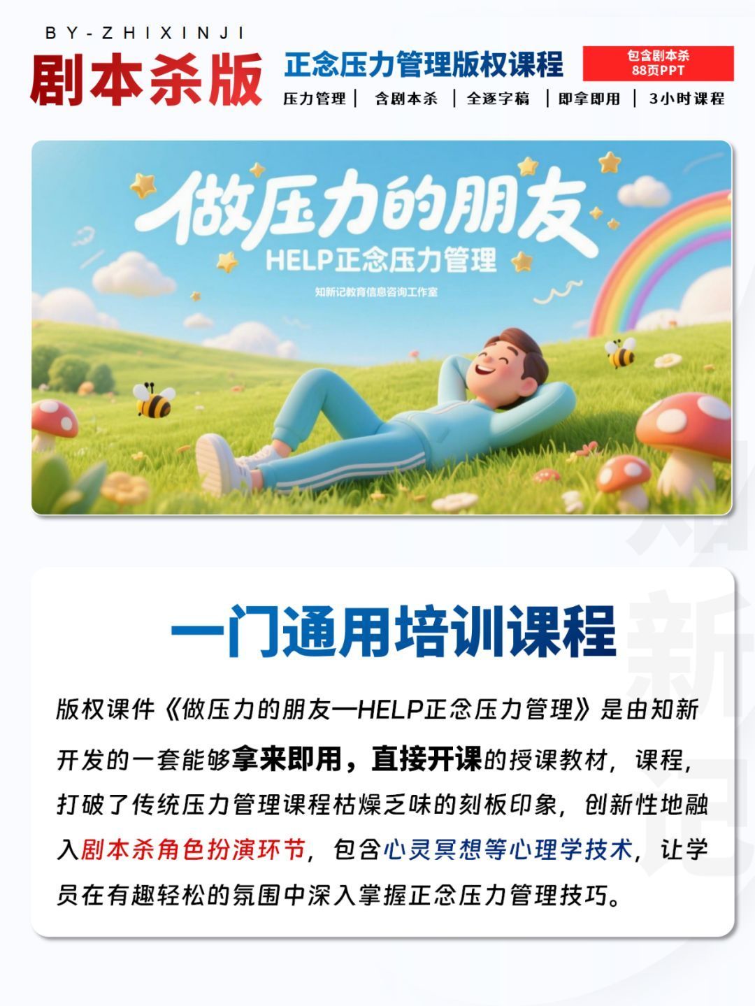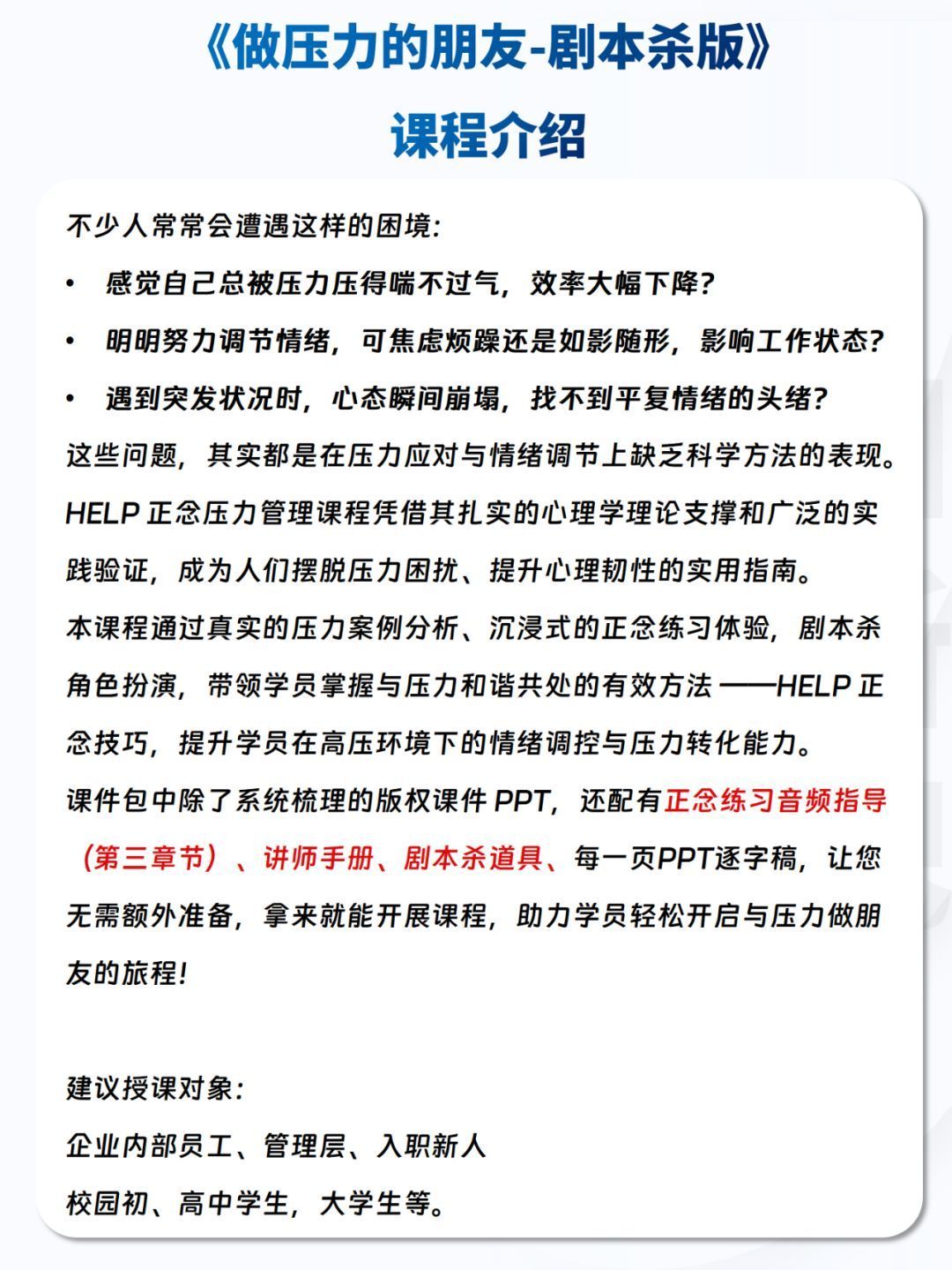 作为一名企业培训师或高中大学老师,你是否也曾苦恼于传统压力管理课程的枯燥?今天想和大家分享一门真正“有趣又实用”的创新课程——《做压力的朋友,HELP 正念压力管理》。结合正念冥想、剧本杀、互动体验,这门课不仅让学员主动参与,更能让压力管理知识在课堂上真正落地。