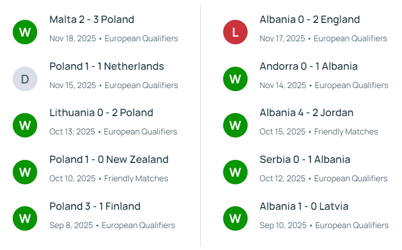 波兰近10场7胜2平1负,上轮客场2-3战胜马耳他,中前场状态火热,但防线隐患凸显,连续两场比赛都有失球。阿尔巴尼亚近10场6胜2平2负,世预赛仅失5球,场均失球不足1粒,防守端稳定性拉满;虽客场面对强队胜率不高,但多次零封或小负,硬仗防守韧性极强。