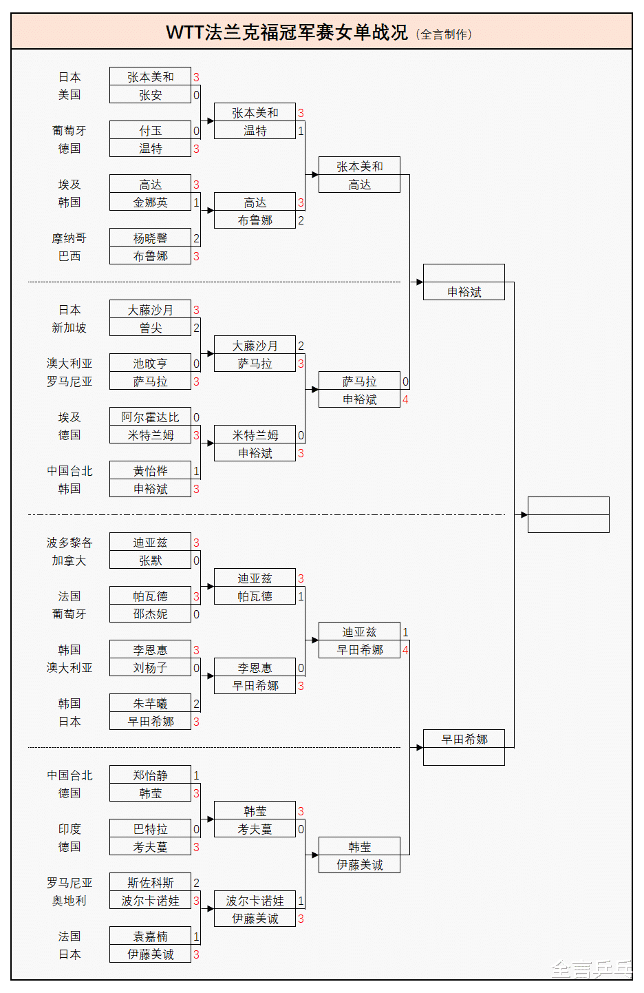 女单:早田希娜(日本)4-1迪亚兹(波多黎各)、申裕斌(韩国)4-0萨马拉(罗马尼亚)。