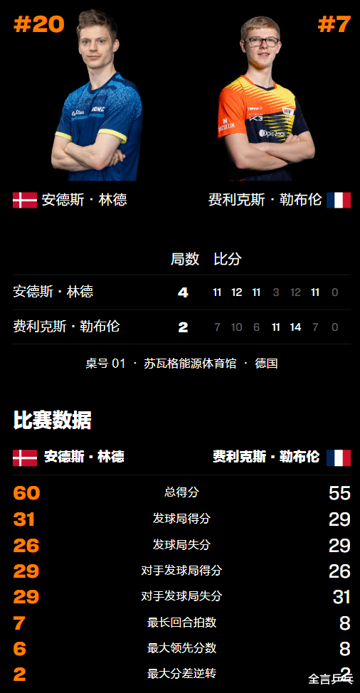 比赛开始后,小勒布伦在首局发挥不佳,在发接发环节非常被动,没有打出自己在近台的速度优势,最终以7-11落败先丢一城。