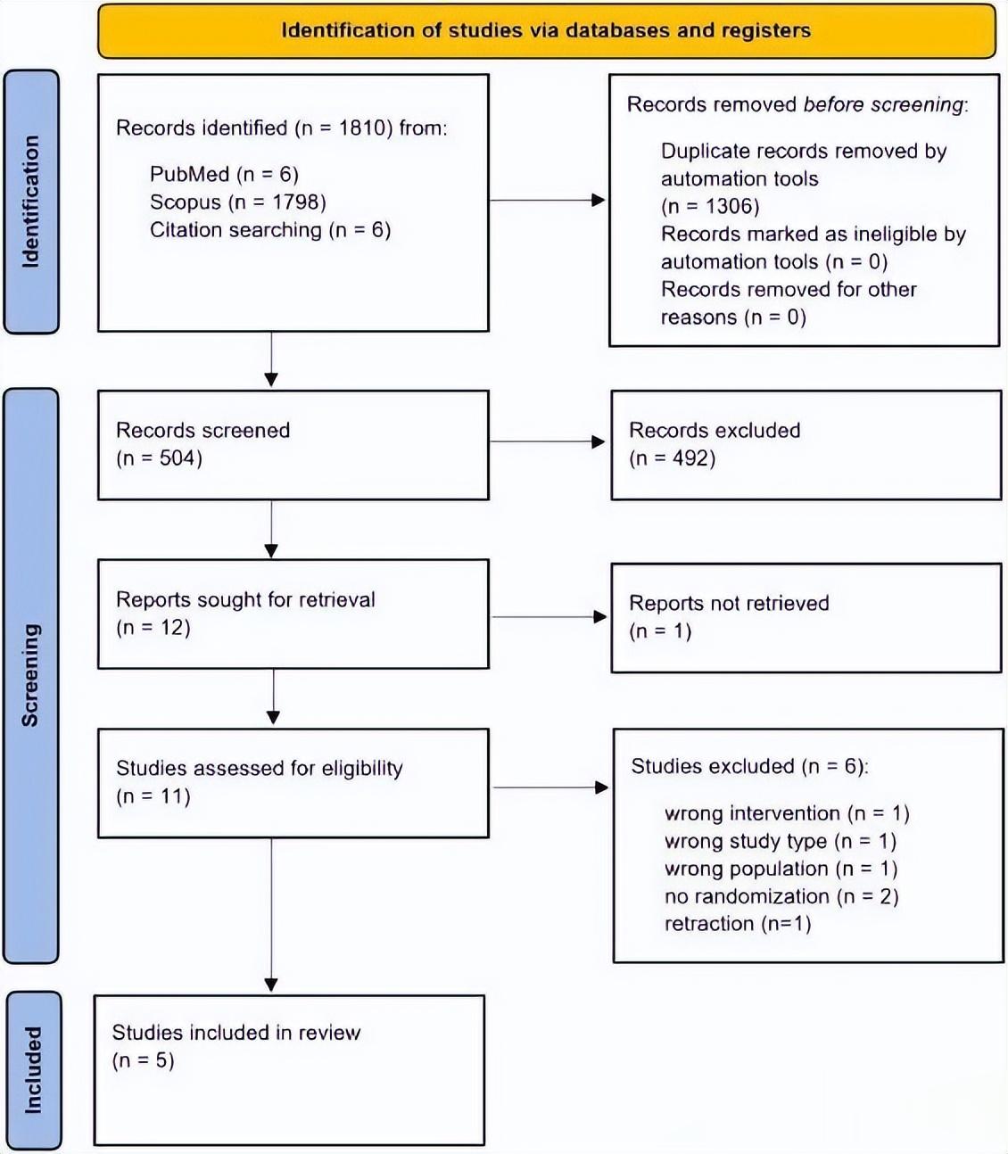 03研究结果如何?研究者检索了1810篇相关文献,最终5篇研究通过了所有严格考核,被纳入最终分析。