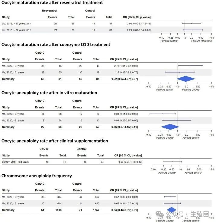 首先来看仅有一项体外试验的白藜芦醇,在卵子培养液里添加白藜芦醇,似乎能提高高龄女性卵子成熟率,从51.35%提高到71.05%。