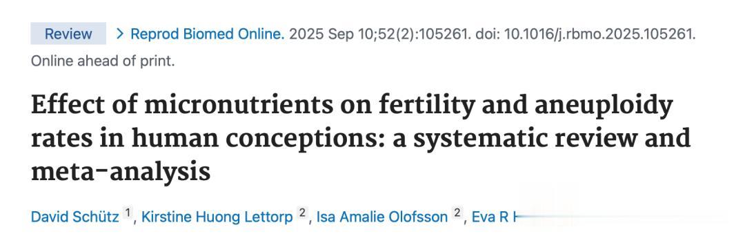 Schütz D, Lettorp KH, Olofsson IA, Hoffmann ER. Effect of micronutrients on fertility and aneuploidy rates in human conceptions: a systematic review and meta-analysis. Reprod Biomed Online. 2025 Sep 10;52(2):105261. doi: 10.1016/j.rbmo.2025.105261. Epub ahead of print. PMID: 41483781.