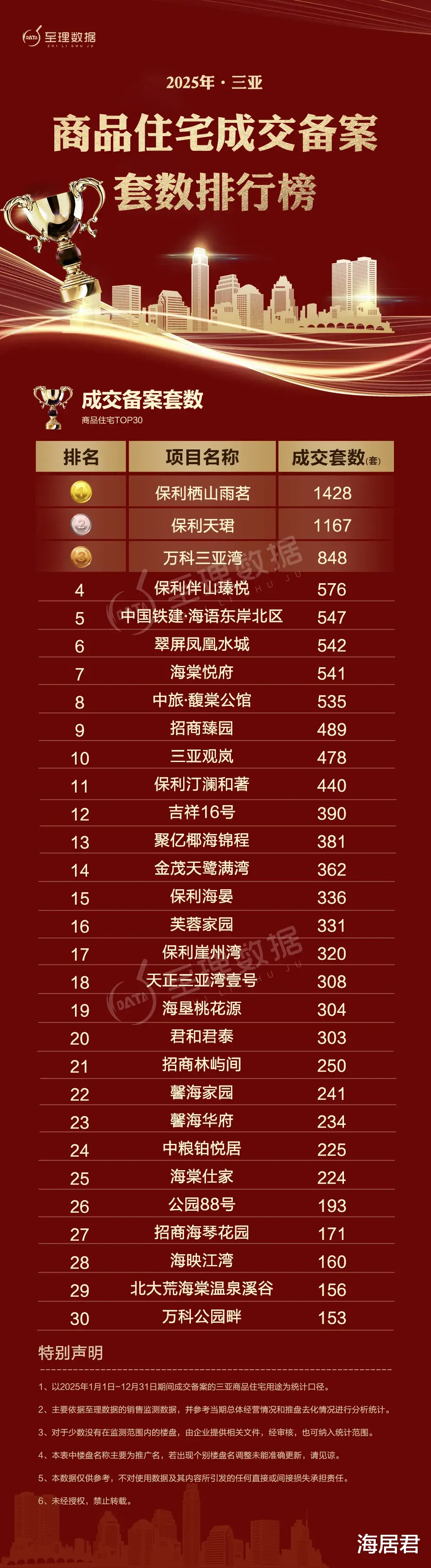 安居房项目保利栖山雨茗全年成交1428套,夺得2025年三亚商品房住宅成交套数冠军。市场化商品住房项目保利天珺成交1167套,夺得销售亚军;万科三亚湾成交848套,斩获销售季军。