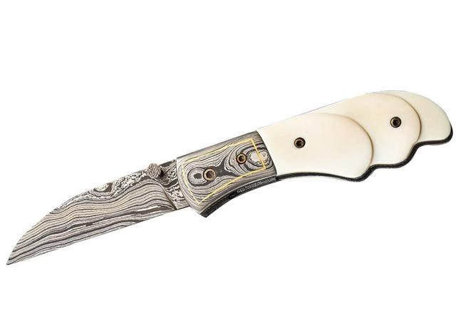 刃长: 2 5/16”刃材: 大马士革开刃方式: 平磨叶片形制: Wharncliffe打开方式: 拇指柱贴片:雕刻的象牙垫枕: 24k金镶嵌大马士革装饰: 背花、微纹理处理、上色、24K金镶嵌内衬材料: 15N20 镍合金钢锁:内衬锁闭合长度: 3.25”作者一把类似刀的价格: $1,776作者: Takach Forge