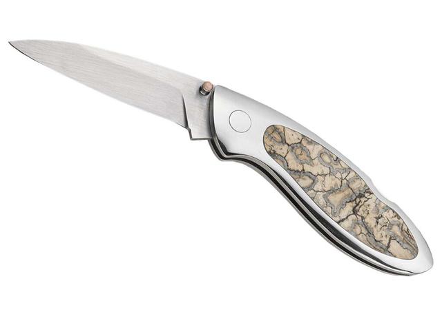 刃长: 3.25”刃材: CPM 154 不锈钢开刃方式: 平磨叶片类型: 改良鸟喙柄镶嵌: 猛犸象牙拇指柱镶嵌: 天使皮肤珊瑚垫枕: 416不锈钢一体式结构闭合长度: 4.75”作者一把类似刀的价格: $850作者: Chris Richardson