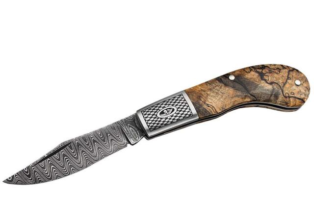 刃长: 3.33”刃材: 大马士革叶片形制: 剪辑点打开方式: 指甲刻痕驱动贴片: 乔治·华盛顿总统种下的最后几棵核桃树之一制成的木料垫枕: 杰瑞·菲斯克雕刻的弹簧钢 。类似刀子的制造价格是 5900 美元(包括一瓶乔治·华盛顿蒸馏厂生产的威士忌)更多信息: 1999年,杰瑞·菲斯克被北卡罗来纳大学威尔明顿分校的世界文化博物馆评为“国家活宝”。作者: Jerry Fisk